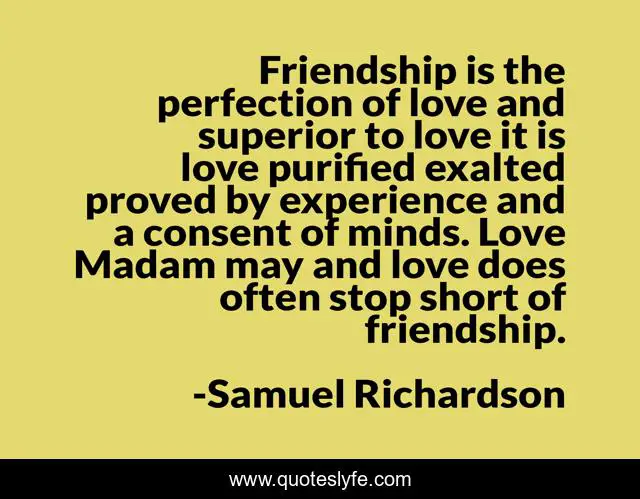 This page presents the quote "Friendship is the perfection of love and superior to love it is love purified exalted proved by experience and a consent of minds. Love Madam may and love does often stop short of friendship.". Author of this quote is Samuel Richardson. .