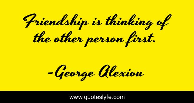 This page presents the quote "Friendship is thinking of the other person first.". Author of this quote is George Alexiou. This quote is about love, joy, integrity, happiness, inspirational, enthusiasm, respect, friendship, affection,.
