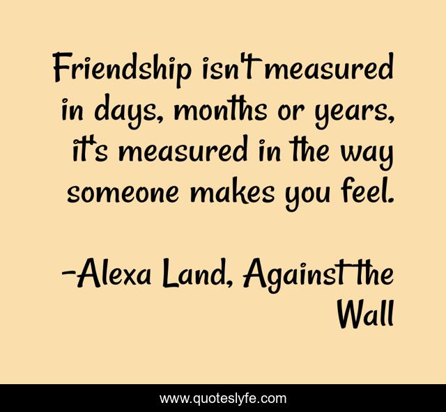 This page presents the quote "Friendship isn't measured in days, months or years, it's measured in the way someone makes you feel.". Author of this quote is Alexa Land, Against the Wall. This quote is about friendships, friendship,.