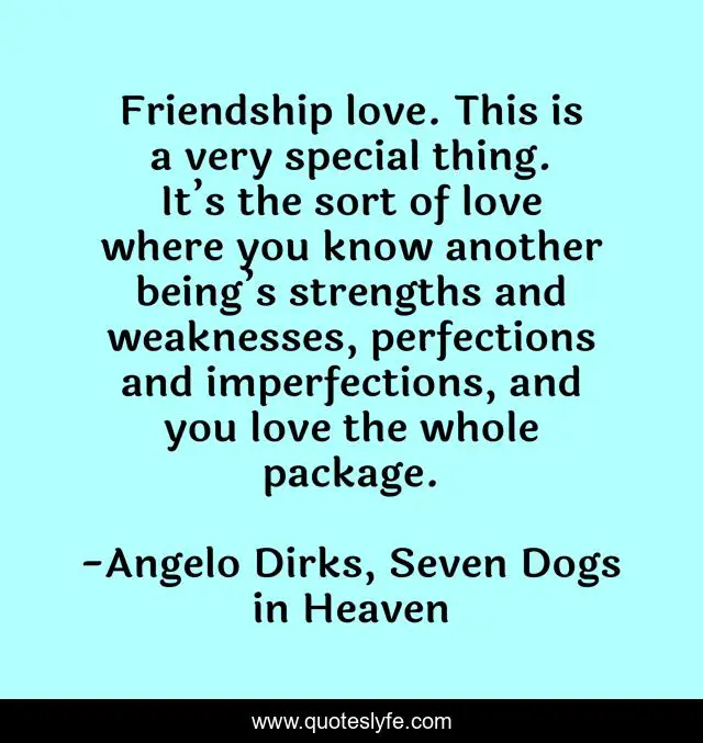This page presents the quote "Friendship love. This is a very special thing. It’s the sort of love where you know another being’s strengths and weaknesses, perfections and imperfections, and you love the whole package.". Author of this quote is Angelo Dirks, Seven Dogs in Heaven. This quote is about friendship, strength, love, affection, weakness,.