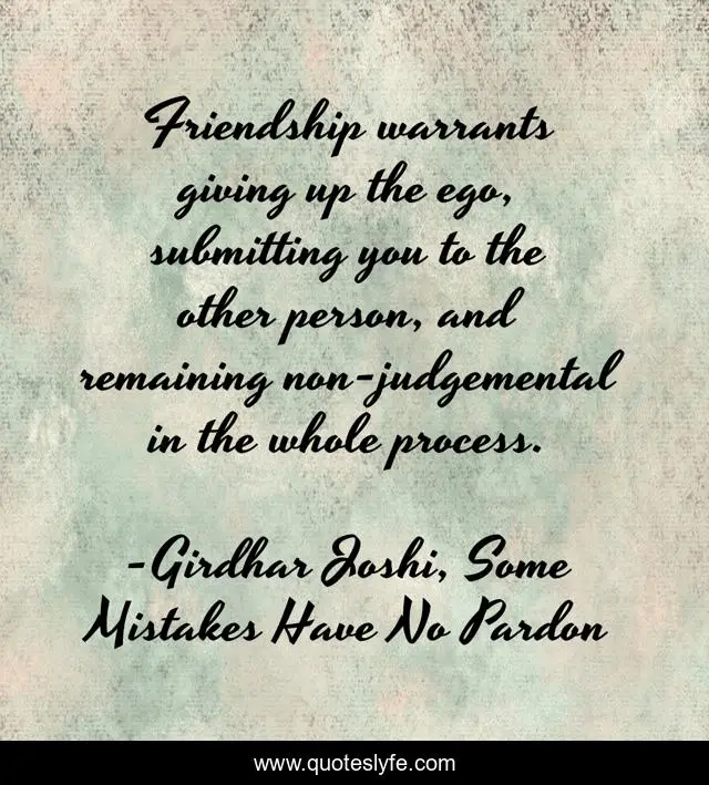 This page presents the quote "Friendship warrants giving up the ego, submitting you to the other person, and remaining non-judgemental in the whole process.". Author of this quote is Girdhar Joshi, Some Mistakes Have No Pardon. This quote is about ego, friendship, nonjudgemental,.
