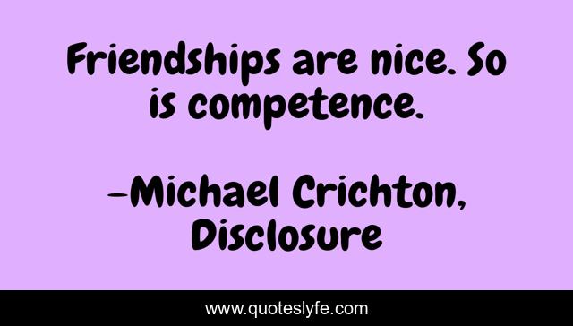 This page presents the quote "Friendships are nice. So is competence.". Author of this quote is Michael Crichton, Disclosure. .