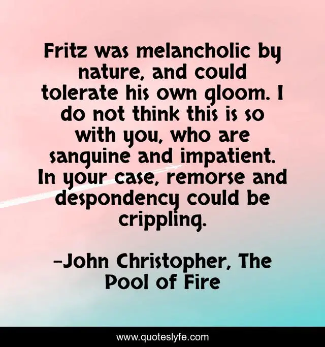 This page presents the quote "Fritz was melancholic by nature, and could tolerate his own gloom. I do not think this is so with you, who are sanguine and impatient. In your case, remorse and despondency could be crippling.". Author of this quote is John Christopher, The Pool of Fire. .