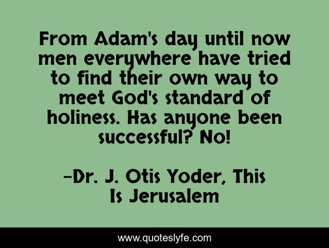 This page presents the quote "From Adam's day until now men everywhere have tried to find their own way to meet God's standard of holiness. Has anyone been successful? No!". Author of this quote is Dr. J. Otis Yoder, This Is Jerusalem. This quote is about holiness, one-way, adam, mankind, god,.