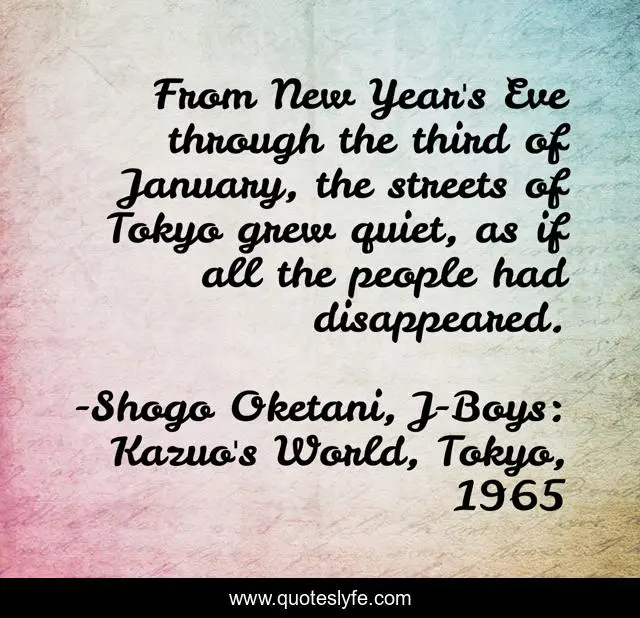 This page presents the quote "From New Year's Eve through the third of January, the streets of Tokyo grew quiet, as if all the people had disappeared.". Author of this quote is Shogo Oketani, J-Boys: Kazuo's World, Tokyo, 1965. This quote is about culture, japan, childhood, tokyo,.