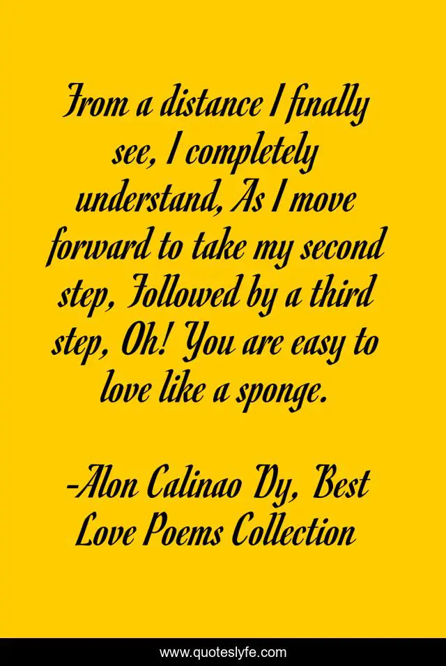 This page presents the quote "From a distance I finally see, I completely understand, As I move forward to take my second step, Followed by a third step, Oh! You are easy to love like a sponge.". Author of this quote is Alon Calinao Dy, Best Love Poems Collection. This quote is about distant-love, love, affection,.