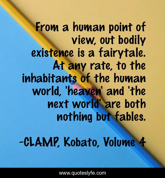 This page presents the quote "From a human point of view, out bodily existence is a fairytale. At any rate, to the inhabitants of the human world, 'heaven' and 'the next world' are both nothing but fables.". Author of this quote is CLAMP, Kobato, Volume 4. This quote is about clamp, the-next-world, heaven, fairytale, kobato, zuishō,.