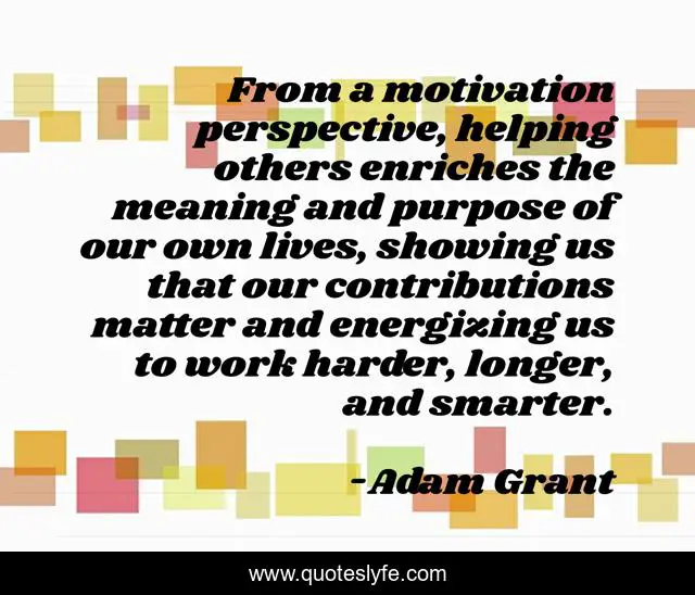 This page presents the quote "From a motivation perspective, helping others enriches the meaning and purpose of our own lives, showing us that our contributions matter and energizing us to work harder, longer, and smarter.". Author of this quote is Adam Grant. This quote is about perspective, purpose,.
