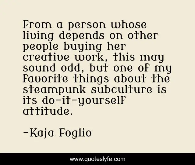 This page presents the quote "From a person whose living depends on other people buying her creative work, this may sound odd, but one of my favorite things about the steampunk subculture is its do-it-yourself attitude.". Author of this quote is Kaja Foglio. This quote is about work, creative, people,.