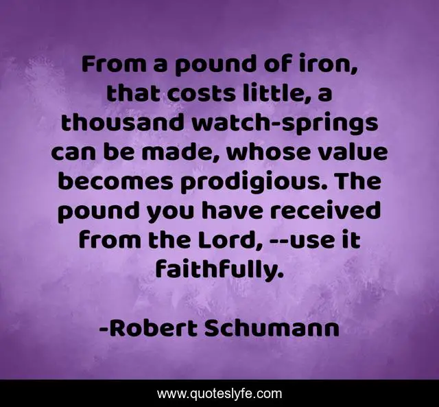 This page presents the quote "From a pound of iron, that costs little, a thousand watch-springs can be made, whose value becomes prodigious. The pound you have received from the Lord, --use it faithfully.". Author of this quote is Robert Schumann. This quote is about faithfulness, talents, work, talent, value,.