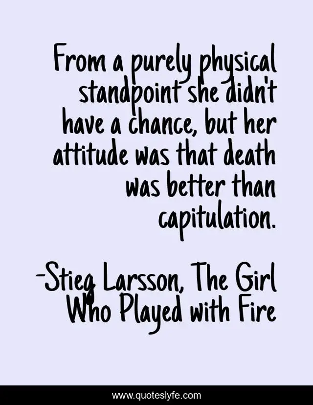 This page presents the quote "From a purely physical standpoint she didn't have a chance, but her attitude was that death was better than capitulation.". Author of this quote is Stieg Larsson, The Girl Who Played with Fire. This quote is about capitularton, courage, death, strength,.