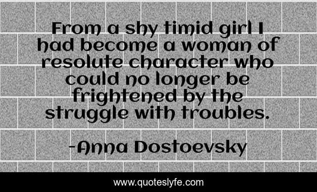 This page presents the quote "From a shy timid girl I had become a woman of resolute character who could no longer be frightened by the struggle with troubles.". Author of this quote is Anna Dostoevsky. This quote is about uncertainties, doubts,.