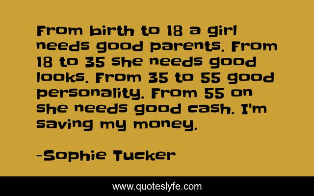 This page presents the quote "From birth to 18 a girl needs good parents. From 18 to 35 she needs good looks. From 35 to 55 good personality. From 55 on she needs good cash. I'm saving my money.". Author of this quote is Sophie Tucker. .