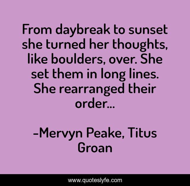 This page presents the quote "From daybreak to sunset she turned her thoughts, like boulders, over. She set them in long lines. She rearranged their order...". Author of this quote is Mervyn Peake, Titus Groan. This quote is about imagery, thoughts,.