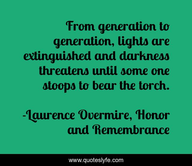 This page presents the quote "From generation to generation, lights are extinguished and darkness threatens until some one stoops to bear the torch.". Author of this quote is Laurence Overmire, Honor and Remembrance. This quote is about conscience, responsibility, generations, hope,.