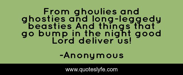 This page presents the quote "From ghoulies and ghosties and long-leggedy beasties And things that go bump in the night good Lord deliver us!". Author of this quote is Anonymous. .