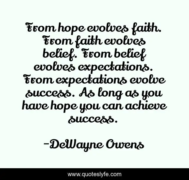 This page presents the quote "From hope evolves faith. From faith evolves belief. From belief evolves expectations. From expectations evolve success. As long as you have hope you can achieve success.". Author of this quote is DeWayne Owens. This quote is about life, inspirational, success, leadership-development, leadership-charteristics, motivational-inspirational, motivational, confidence, wisdom,.