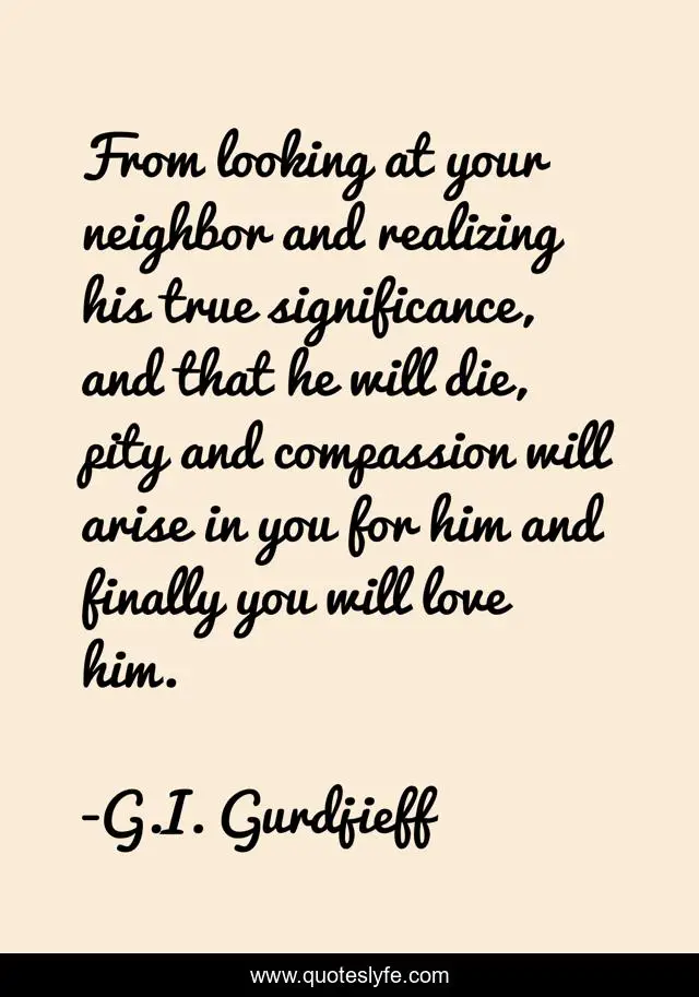 This page presents the quote "From looking at your neighbor and realizing his true significance, and that he will die, pity and compassion will arise in you for him and finally you will love him.". Author of this quote is G.I. Gurdjieff. This quote is about compassion, life, death, love, affection,.