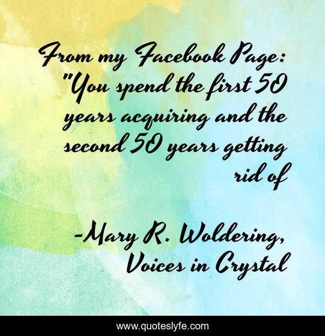 This page presents the quote "From my Facebook Page: "You spend the first 50 years acquiring and the second 50 years getting rid of". Author of this quote is Mary R. Woldering, Voices in Crystal. This quote is about science-fiction-fantasy, historical-fiction,.