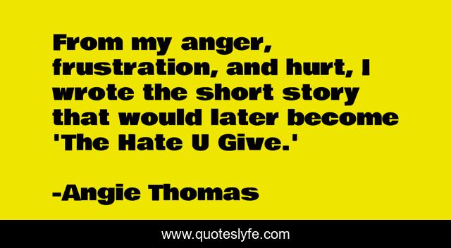 This page presents the quote "From my anger, frustration, and hurt, I wrote the short story that would later become 'The Hate U Give.'". Author of this quote is Angie Thomas. This quote is about short, hate, hurt,.