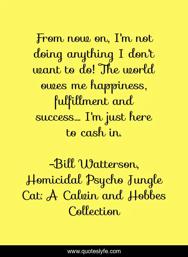 This page presents the quote "From now on, I'm not doing anything I don't want to do! The world owes me happiness, fulfillment and success.... I'm just here to cash in.". Author of this quote is Bill Watterson, Homicidal Psycho Jungle Cat: A Calvin and Hobbes Collection. .
