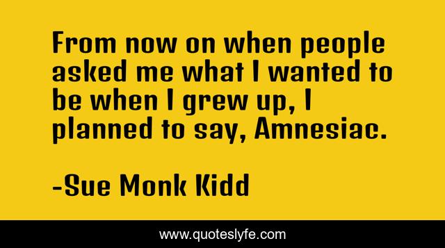 This page presents the quote "From now on when people asked me what I wanted to be when I grew up, I planned to say, Amnesiac.". Author of this quote is Sue Monk Kidd. This quote is about memories, life, humor,.