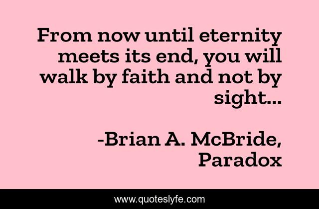 This page presents the quote "From now until eternity meets its end, you will walk by faith and not by sight...". Author of this quote is Brian A. McBride, Paradox. This quote is about faith, book, inspirational, enthusiasm,.