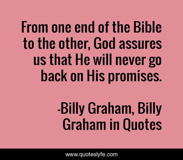This page presents the quote "From one end of the Bible to the other, God assures us that He will never go back on His promises.". Author of this quote is Billy Graham, Billy Graham in Quotes. This quote is about bible, billy-graham,.