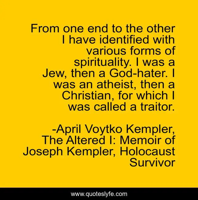This page presents the quote "From one end to the other I have identified with various forms of spirituality. I was a Jew, then a God-hater. I was an atheist, then a Christian, for which I was called a traitor.". Author of this quote is April Voytko Kempler, The Altered I: Memoir of Joseph Kempler, Holocaust Survivor. This quote is about holocaust-survivor, holocaust-narrative, memoir,.