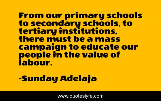 This page presents the quote "From our primary schools to secondary schools, to tertiary institutions, there must be a mass campaign to educate our people in the value of labour.". Author of this quote is Sunday Adelaja. This quote is about labour, education, institutions, value,.