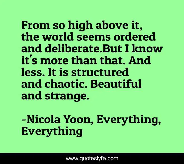 This page presents the quote "From so high above it, the world seems ordered and deliberate.But I know it's more than that. And less. It is structured and chaotic. Beautiful and strange.". Author of this quote is Nicola Yoon, Everything, Everything. This quote is about everything-everything, beauty, space, nicola-yoon, young-adult-romance, chaos, young-adult-fiction, world, young-adult,.
