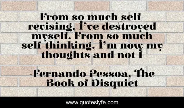 This page presents the quote "From so much self-revising, I’ve destroyed myself. From so much self-thinking, I’m now my thoughts and not I". Author of this quote is Fernando Pessoa, The Book of Disquiet. This quote is about self, thoughts,.