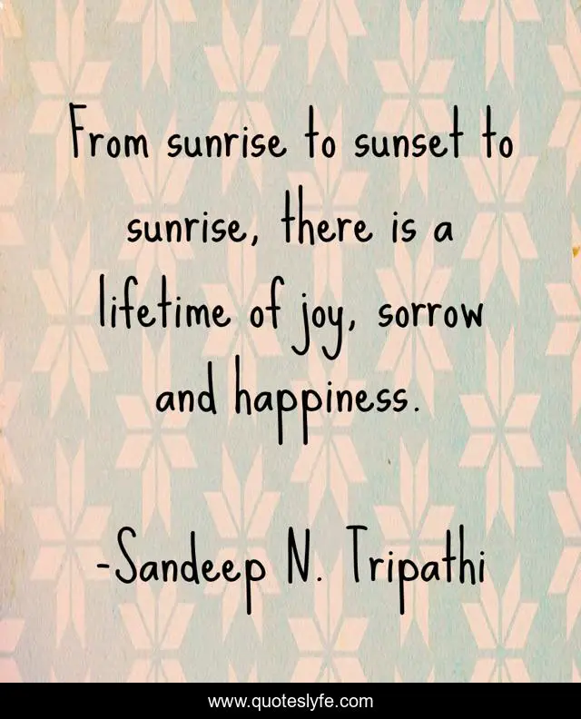 This page presents the quote "From sunrise to sunset to sunrise, there is a lifetime of joy, sorrow and happiness.". Author of this quote is Sandeep N. Tripathi. This quote is about joy, sorrow, joy-of-life, sunset, happiness, sunrise,.