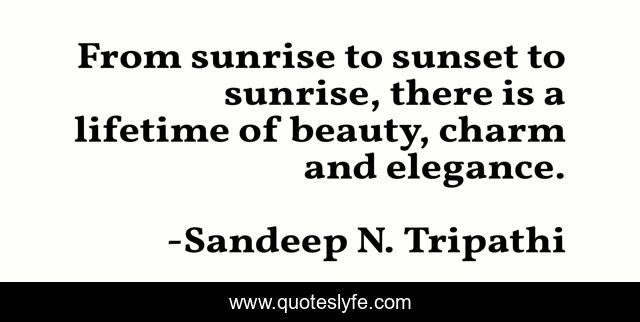 This page presents the quote "From sunrise to sunset to sunrise, there is a lifetime of beauty, charm and elegance.". Author of this quote is Sandeep N. Tripathi. This quote is about beauty, sunset, charm, elegance, sunrise,.