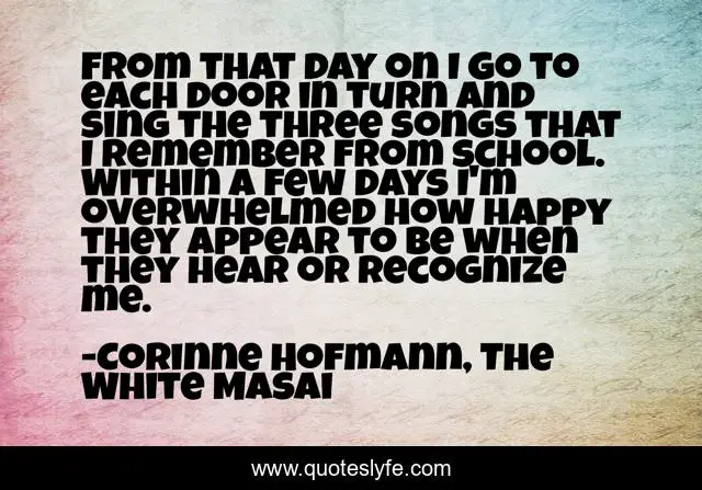 This page presents the quote "From that day on I go to each door in turn and sing the three songs that I remember from school. Within a few days I'm overwhelmed how happy they appear to be when they hear or recognize me.". Author of this quote is Corinne Hofmann, The White Masai. This quote is about love, africa, missionary-hospital, service-to-others, friendship, affection,.