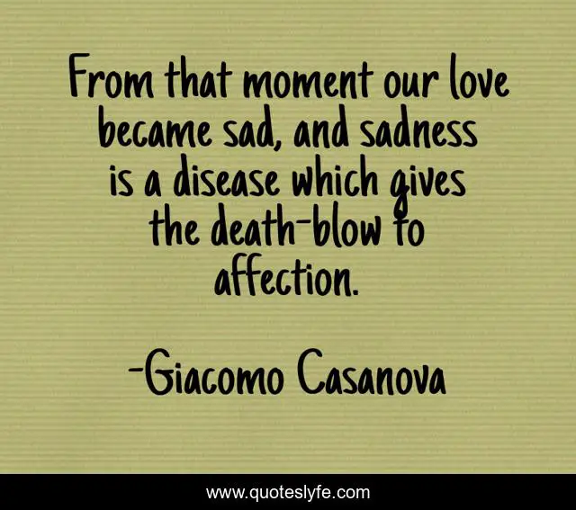 This page presents the quote "From that moment our love became sad, and sadness is a disease which gives the death-blow to affection.". Author of this quote is Giacomo Casanova. This quote is about sadness, love, affection,.