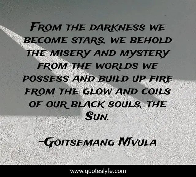 This page presents the quote "From the darkness we become stars, we behold the misery and mystery from the worlds we possess and build up fire from the glow and coils of our black souls, the Sun.". Author of this quote is Goitsemang Mvula. This quote is about fire, sun, african-women, african,.
