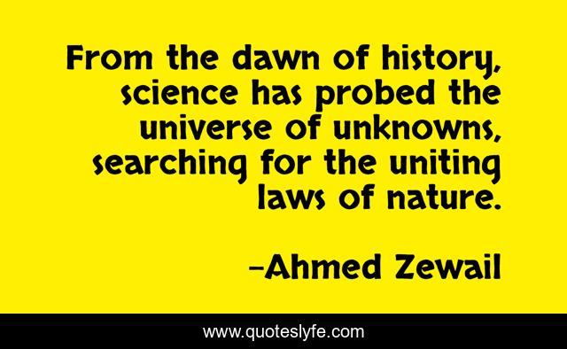 This page presents the quote "From the dawn of history, science has probed the universe of unknowns, searching for the uniting laws of nature.". Author of this quote is Ahmed Zewail. This quote is about science, history, universe,.