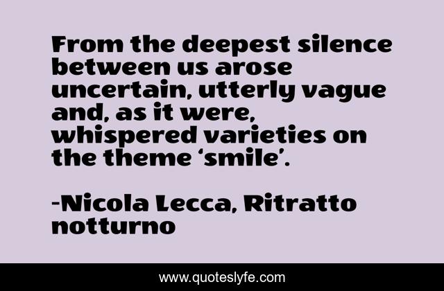 This page presents the quote "From the deepest silence between us arose uncertain, utterly vague and, as it were, whispered varieties on the theme ‘smile’.". Author of this quote is Nicola Lecca, Ritratto notturno. This quote is about shyness, smile, connection, falling-in-love, happiness,.