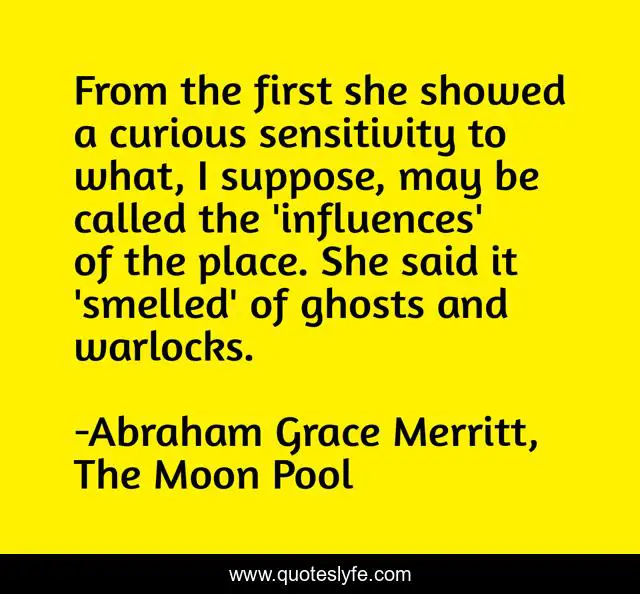 This page presents the quote "From the first she showed a curious sensitivity to what, I suppose, may be called the 'influences' of the place. She said it 'smelled' of ghosts and warlocks.". Author of this quote is Abraham Grace Merritt, The Moon Pool. This quote is about sci-fi, pulp-fiction,.