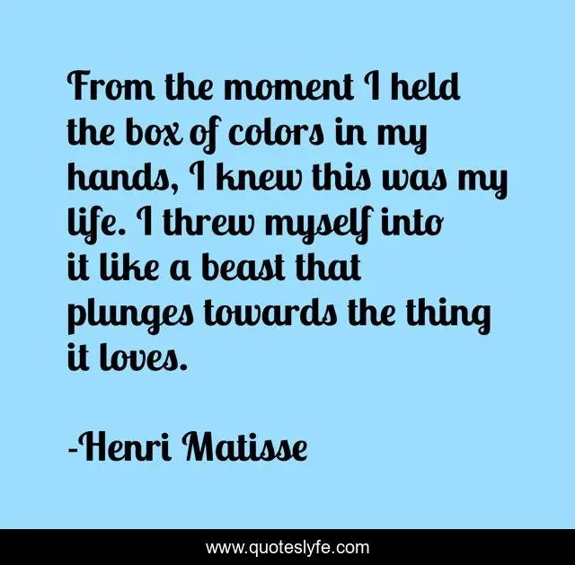 This page presents the quote "From the moment I held the box of colors in my hands, I knew this was my life. I threw myself into it like a beast that plunges towards the thing it loves.". Author of this quote is Henri Matisse. This quote is about fauvism, life, art, artist, inspirational, enthusiasm,.
