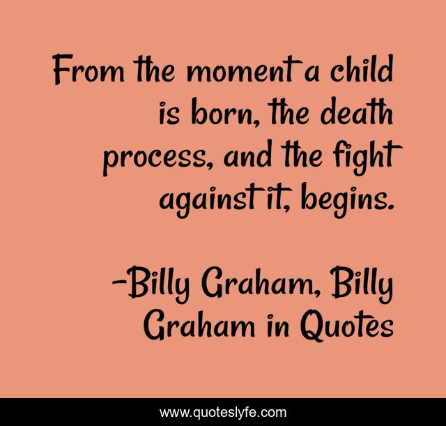 This page presents the quote "From the moment a child is born, the death process, and the fight against it, begins.". Author of this quote is Billy Graham, Billy Graham in Quotes. This quote is about death, billy-graham,.