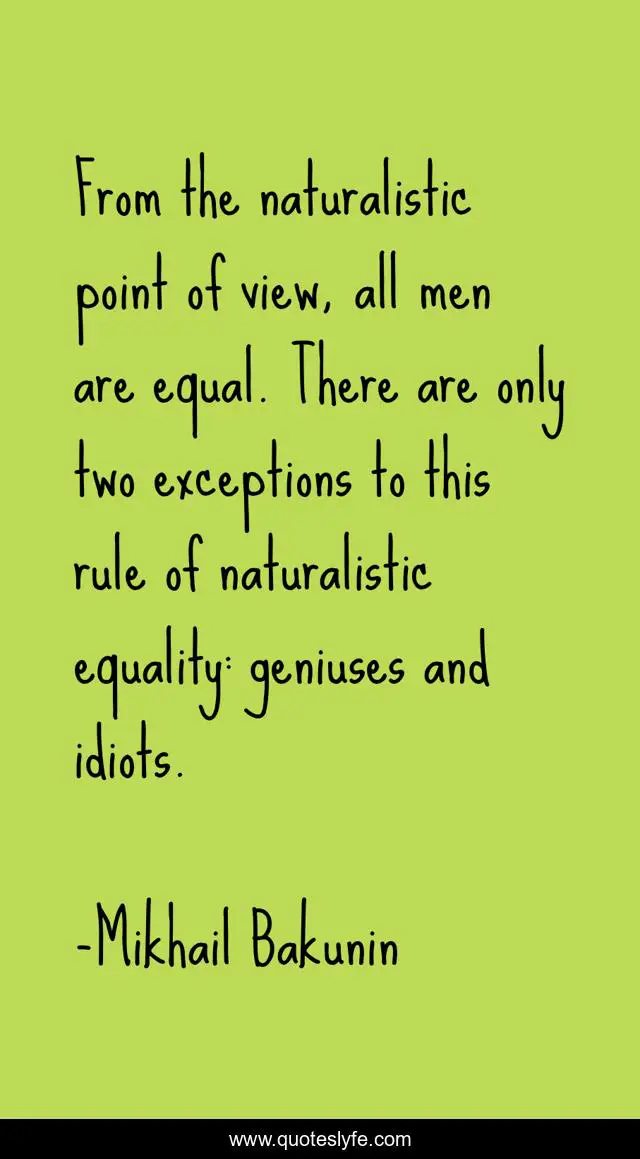 This page presents the quote "From the naturalistic point of view, all men are equal. There are only two exceptions to this rule of naturalistic equality: geniuses and idiots.". Author of this quote is Mikhail Bakunin. This quote is about point of view, men, view,.