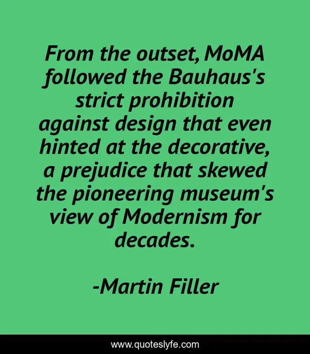 This page presents the quote "From the outset, MoMA followed the Bauhaus's strict prohibition against design that even hinted at the decorative, a prejudice that skewed the pioneering museum's view of Modernism for decades.". Author of this quote is Martin Filler. This quote is about museum, prejudice, view,.
