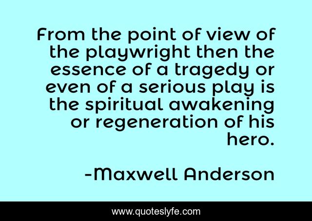 This page presents the quote "From the point of view of the playwright then the essence of a tragedy or even of a serious play is the spiritual awakening or regeneration of his hero.". Author of this quote is Maxwell Anderson. This quote is about acting, theatre,.