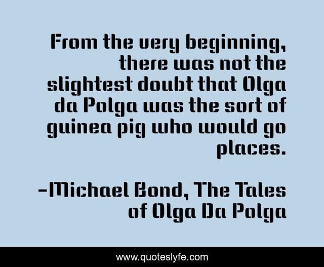 This page presents the quote "From the very beginning, there was not the slightest doubt that Olga da Polga was the sort of guinea pig who would go places.". Author of this quote is Michael Bond, The Tales of Olga Da Polga. This quote is about guinea-pigs, destiny, pets,.