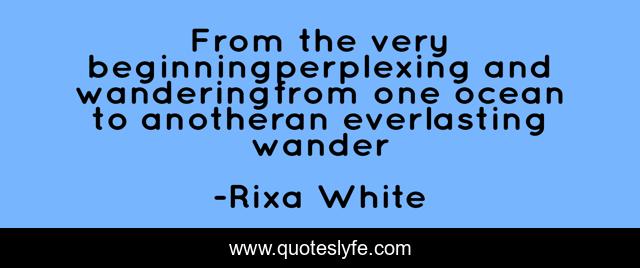 This page presents the quote "From the very beginningperplexing and wanderingfrom one ocean to anotheran everlasting wander". Author of this quote is Rixa White. This quote is about perplexing, beginning, silentaria, ocean, what-s-real, rixa-white, everlasting-wander, wandering, illusion,.