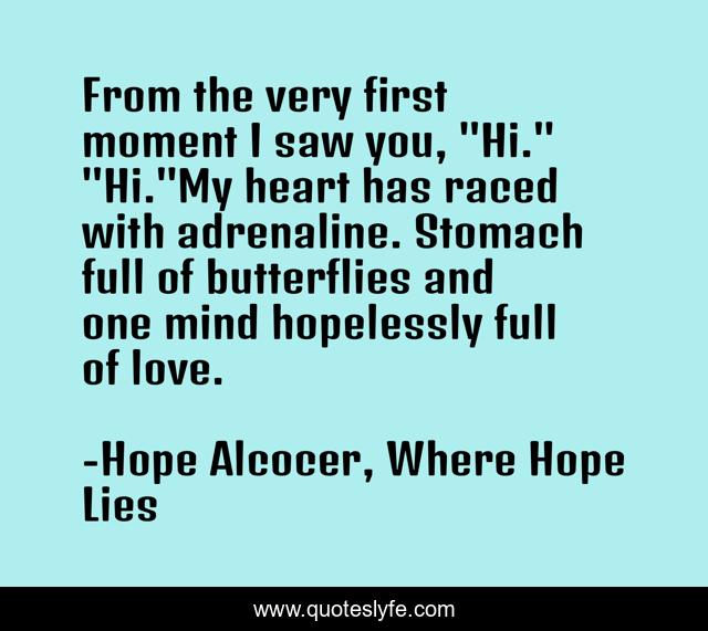 This page presents the quote "From the very first moment I saw you, "Hi." "Hi."My heart has raced with adrenaline. Stomach full of butterflies and one mind hopelessly full of love.". Author of this quote is Hope Alcocer, Where Hope Lies. This quote is about hope-alcocer, love, where-hope-lies, romance, romance-novels, affection,.