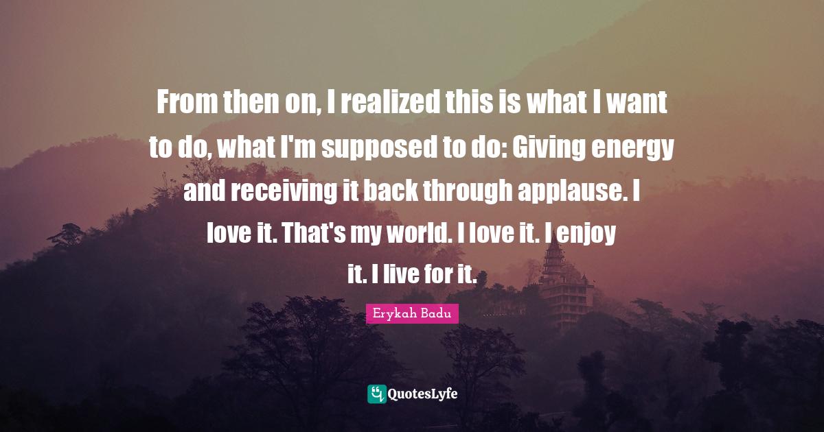 This page presents the quote "From then on, I realized this is what I want to do, what I'm supposed to do: Giving energy and receiving it back through applause. I love it. That's my world. I love it. I enjoy it. I live for it.". Author of this quote is Erykah Badu. This quote is about love, receiving, enjoy, applause, want, giving, energy, i realized, world,.
