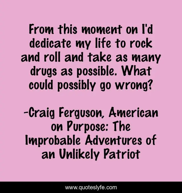 This page presents the quote "From this moment on I'd dedicate my life to rock and roll and take as many drugs as possible. What could possibly go wrong?". Author of this quote is Craig Ferguson, American on Purpose: The Improbable Adventures of an Unlikely Patriot. This quote is about drugs, humor, rock-and-roll,.